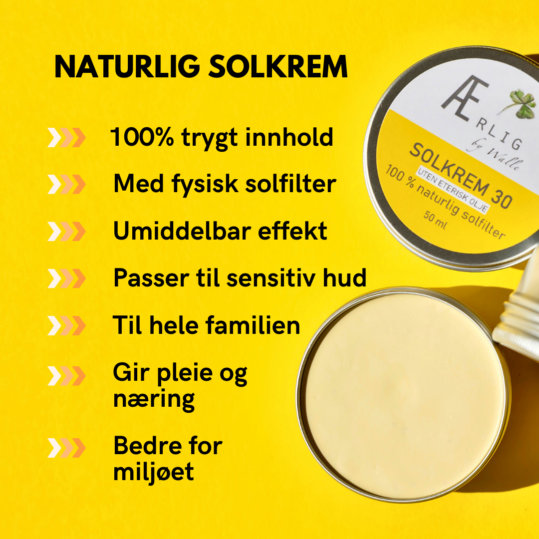 Vi mener at det vi smører på huden, skal inneholde 100% trygge ingredienser. Mange solkremer inneholder kjemikalier som kan være skadelige både for hud, kropp og miljø. Vi i Ærlig by Walle velger bort unødvendig og tvilsomt innhold – vi går for få, trygge ingredienser! Våre solkremer er basert på næringsrikt talg og nøye utvalgte oljer av høy kvalitet. Her får du altså ikke bare solbeskyttelse, men produkter som også gir huden pleie og fuktighet. Du finner vår solkrem her!