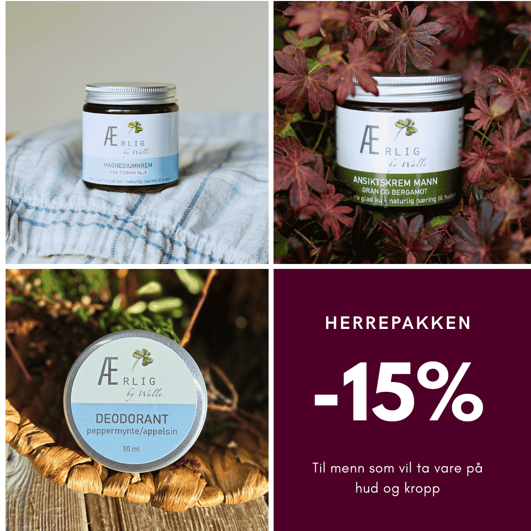 PAKKETILBUD MANN – Pakken for deg som ønsker ta vare på hud og kropp med 100% naturlige ingredienser. Her får du litt av alt – til ansikt, kropp + trygg og effektiv deo!